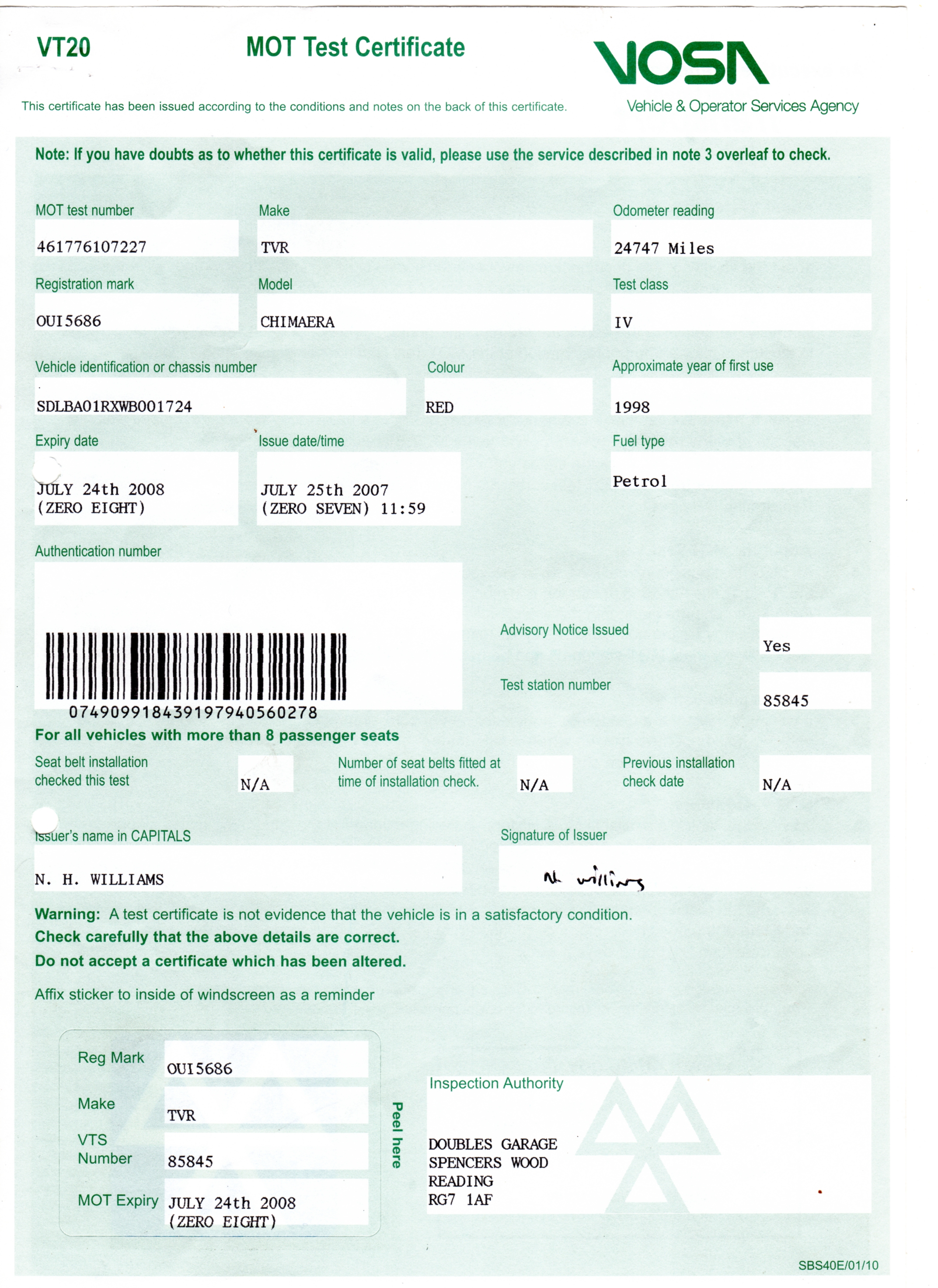 MOT on 25/07/2007
